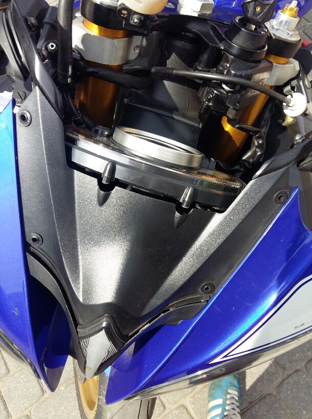 Po zdjęciu szybki mam ten plastik co osłania spod licznika i jest on przykrecony na 2 śroby (zaznaczone na czerwono) a żeby je odkręcić musiał bym zdjąć ten tunel środkowy od powietrza, jest jakaś szybsza droga do kostki lub zdjęcia tego plastiku pod szybką