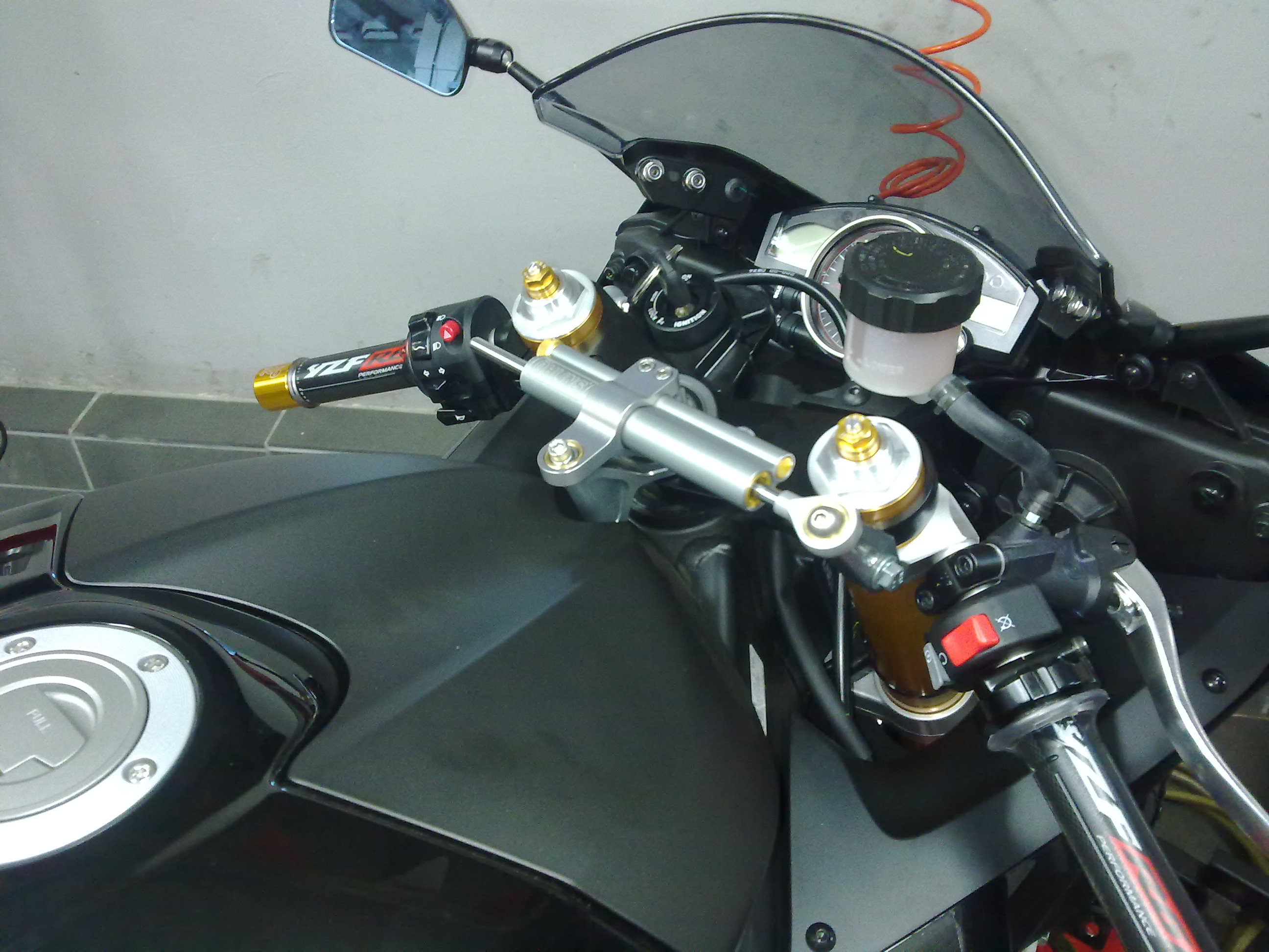 Komentarz: klamki, manetki, zbiorniczek i lustrerka Rizoma, wyświetlacz biegów, przyciemniona szyba Puig