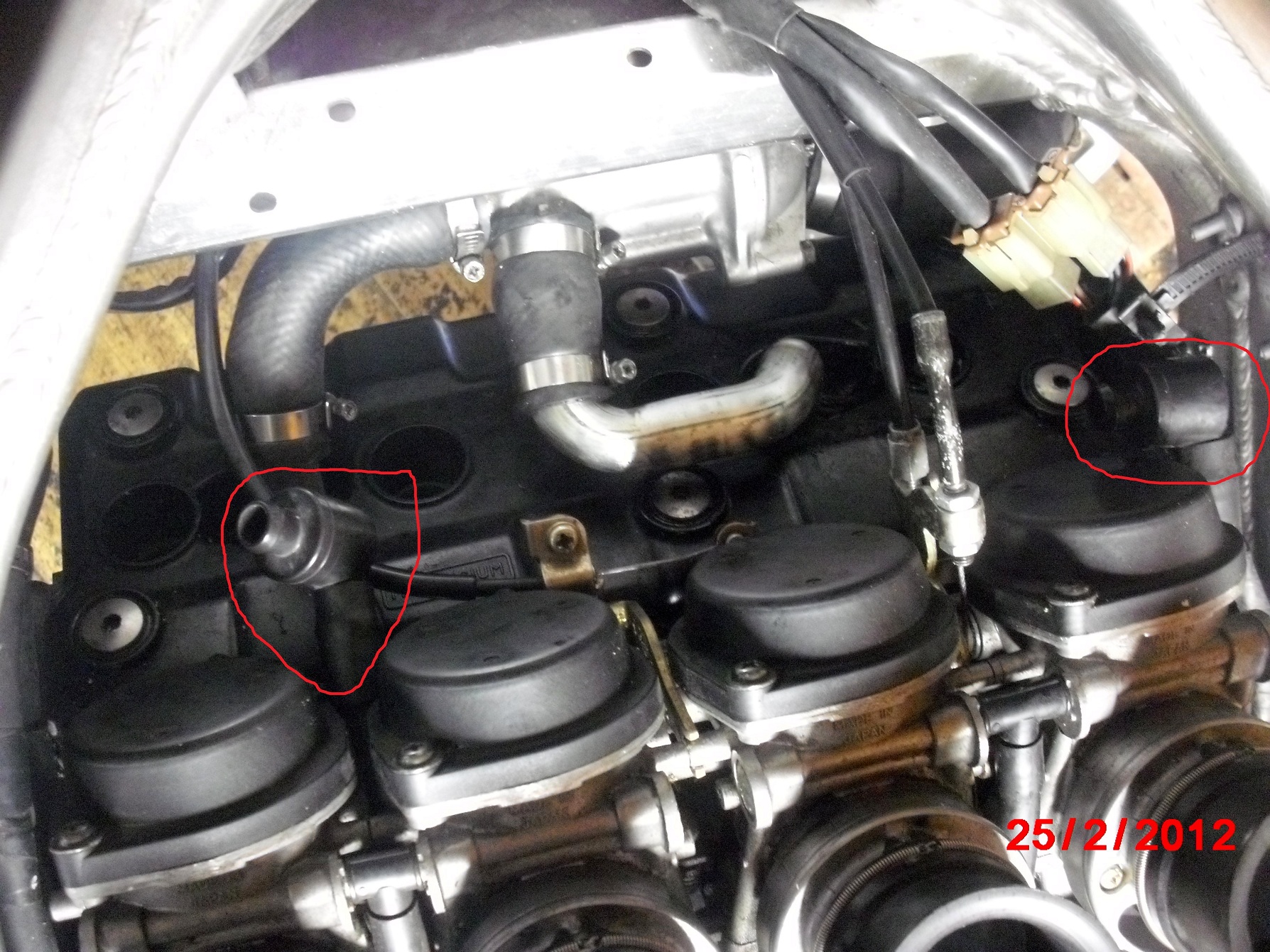 Przy pierwszym zdjeciu ja mam podlaczony wezyk ktory wychodzi na zewnatrz moto i tyle.Tamte dwa tak samo jak u Ciebie.Mysle,ze mozesz zostawi tak jak jest,bo wezyk raczej nie wiele tu doda.Te pierdolniki to sa odpowietrzniki komor plywakowych jesli dobrz pamietam.Poprawcie jesli sie myle