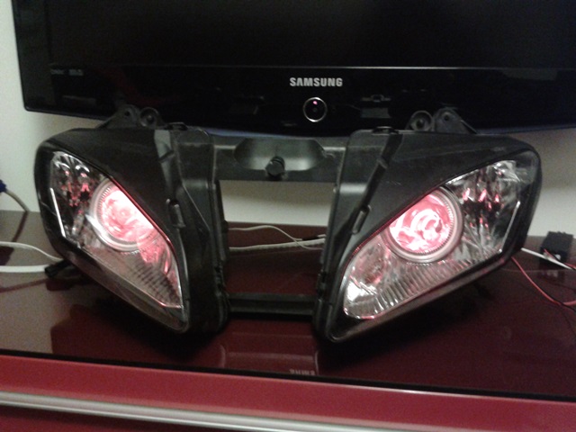 Po zmontowaniu wszystkiego lampa wyglada tak. Potem trzeba to zamontować do moto :P i tu życzę powodzenia w upychaniu. Bo trzeba tam upchać 2xprzetwornice CCFL, 2xprzetwornica bixenon, sterownik bixenon, sterownik do ledów rgb bo mam na pilota :P